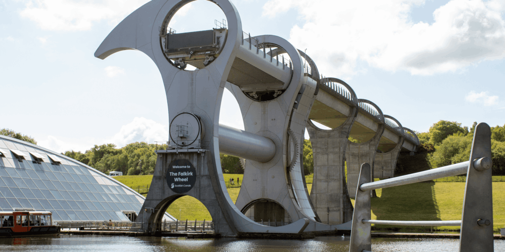 The Falkirk Wheel is a testament to innovative engineering and design. It efficiently transfers boats between the two canals, which have a significant height difference. The design is based on Archimedes’ principle, ensuring that the wheel is always balanced, regardless of the size or weight of the boats being lifted [watch a video here]. This ingenious design means the wheel uses very little power to operate. Visitors can witness this amazing process and learn about the history of Scotland’s canals at the visitor centre.